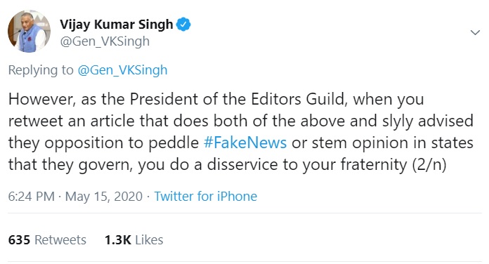 Taking a note against the misinformation war by the Congress ecosystem against the ruling BJP, Minister of State for Road Transport and Highways, former army chief General VK Singh on Friday lambasted Shekhar Gupta for his endorsement of fake news campaign to target the Modi government.