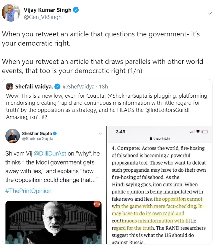 In his tweet, Retd General VK Singh said that it is a democratic right to retweet an article that questions the government and also when the article draws parallels with other world events.