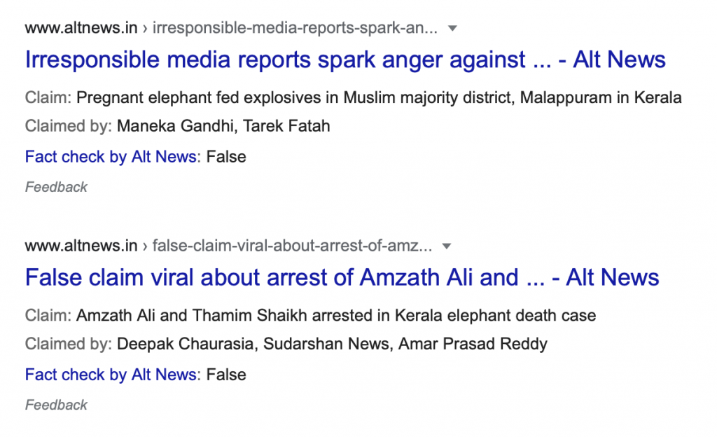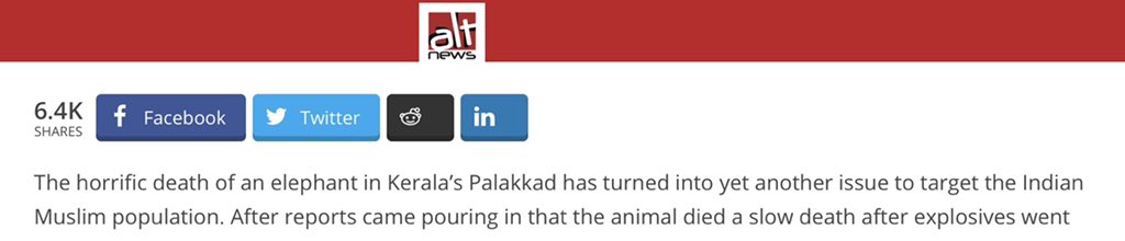 In the article, AltNews quoted the Kerala forest minister and the chief minister to say that the incident happened in Palakkad. While that information is correct, AltNews blatantly claimed that the district being misquoted led to an anti-Muslim wave.