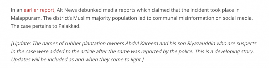 However, after the news of the names of the suspects being Abdul Kareem and son Riyasudheen surfaced, AltNews, while retaining this paragraph, added another one: