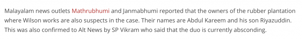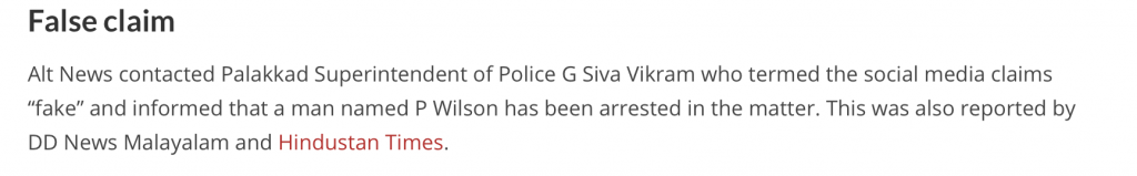 In their earlier ‘fact-check’, AltNews had claimed that they spoke to Palakkad Superintendent of Police, Mr G Siva Vikram. AltNews then quotes him to give a sweeping statement that claims of the perpetrators being Muslim is ‘fake’ and that one P Wilson was arrested in the matter.
