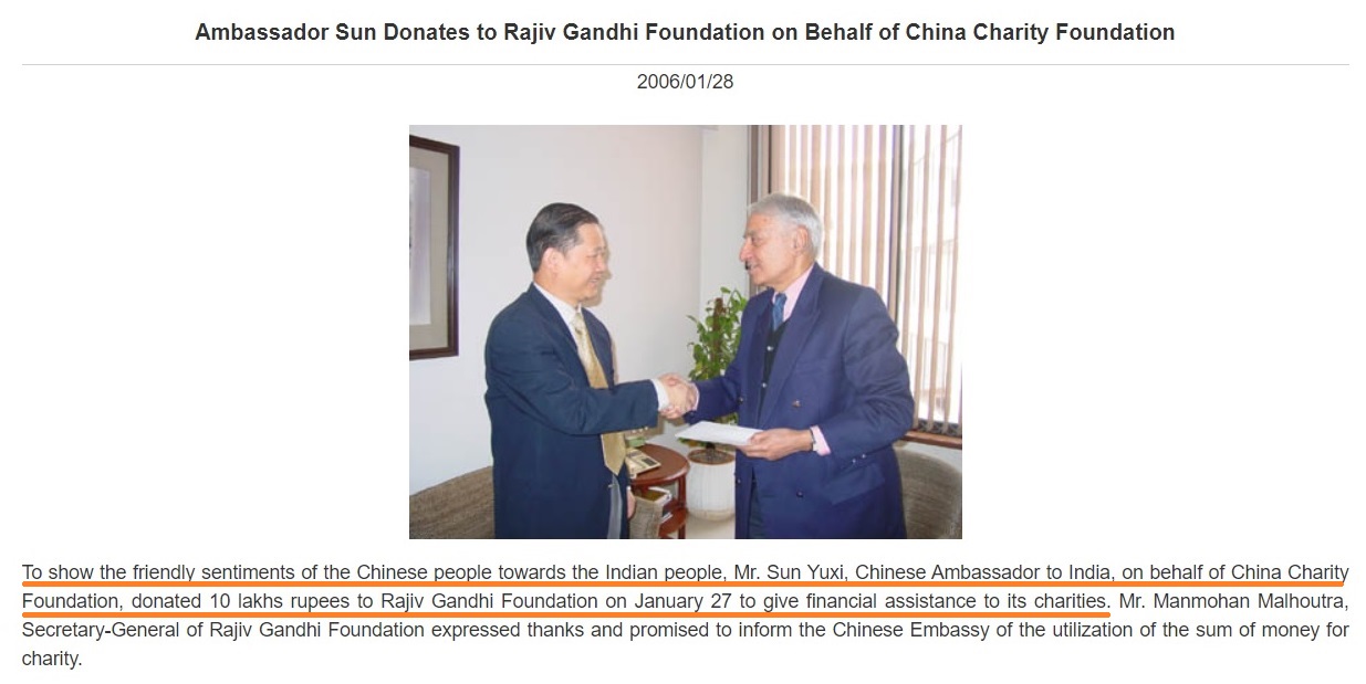 “To show the friendly sentiments of the Chinese people towards the Indian people, Mr. Sun Yuxi, Chinese Ambassador to India, on behalf of China Charity Foundation, donated 10 lakhs rupees to Rajiv Gandhi Foundation on January 27 to give financial assistance to its charities,” the Chinese Embassy in India website reads.