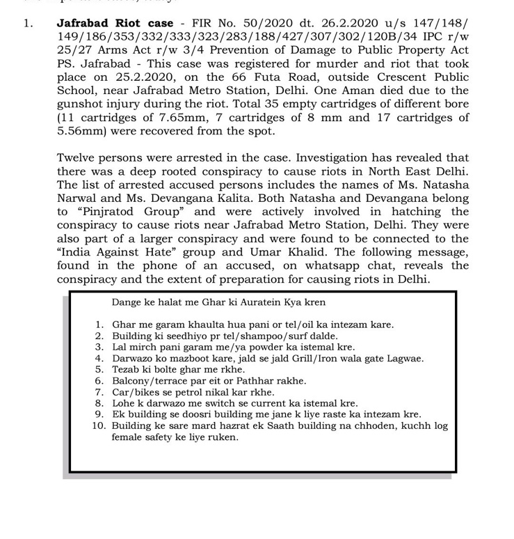 The Delhi Police had alleged that both the women-Natasha and Devangana were involved in hatching the conspiracy to incite riots in Jafrabad. Natasha was booked under the stringent Unlawful Activities Prevention Act (UAPA) for her role in inciting the anti-Hindu communal riots in Northeast Delhi in February. The FIR against them mentions that they are charged under Sections 147, 148, 149, 186, 353, 332, 333, 323, 283, 188, 427, 307, 302, 120B, 34 of the Indian Penal Code and under the Arms Act and Prevention of Damage to Public Property Act. The two arrested women were also a part of a larger conspiracy and were found to be associated with “India Against Hate” group and Umar Khalid.