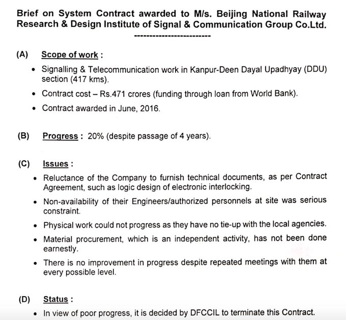 Dedicated Freight Corridor Corporation of India (DFCCIL), a public sector undertaking corporation run by the Indian Railways, has begun the process to cancel the project contracts awarded to Beijing National Railway Research and Design Institute of Signal and Communication Group, citing poor work progress.