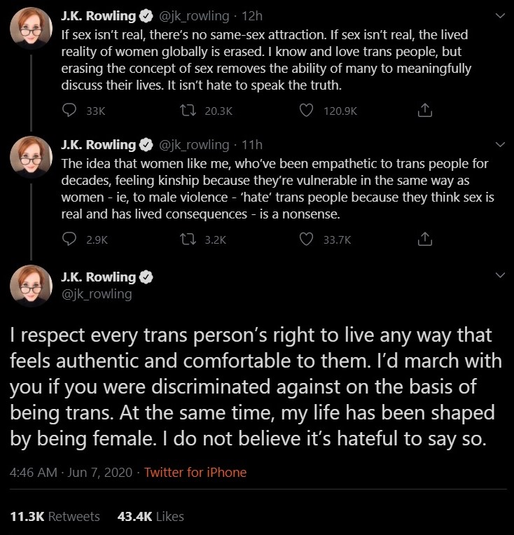“The idea that women like me, who’ve been empathetic to trans people for decades, feeling kinship because they’re vulnerable in the same way as women – ie, to male violence – ‘hate’ trans people because they think sex is real and has lived consequences – is a nonsense,” J.K. Rowling added.