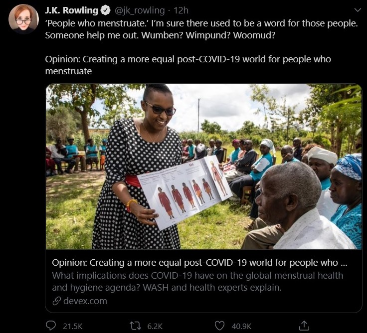 It all began when J.K. Rowling expressed her unhappiness over the fact that the headline of an opinion piece published on a media portal addressed women as ‘people who menstruate’ instead of the actual word. This is due to the fact that in the world of the Left, it is believed that gender is a social construct and a menstruating women can actually be a man if she calls herself one and society must address her as a man. If one accepts such a premise, then it cannot be said that it is only women who menstruate.