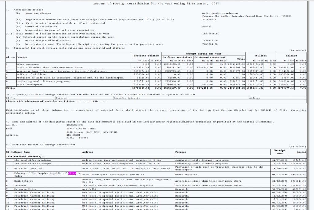 One sinister aspect that emerged is that even in 2005-2006, it was not just the Embassy of China that had donated to Rajiv Gandhi Foundation, but also the Chinese government itself.