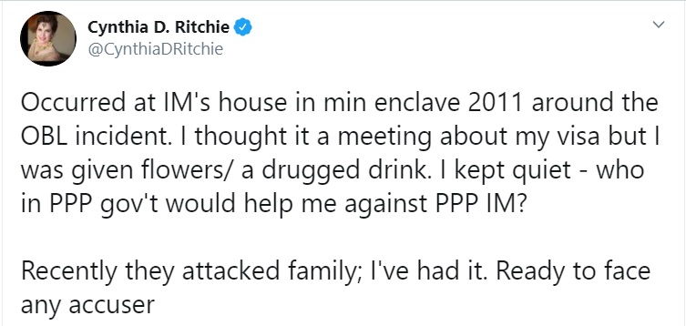 Cynthia Dawn Ritchie, who has close connections with the current Pakistani ruling establishment, also alleged that she was assaulted by other senior leaders of the Pakistan Peoples Party (PPP). She also alleged that her e-mail accounts were hacked and people spied on her.