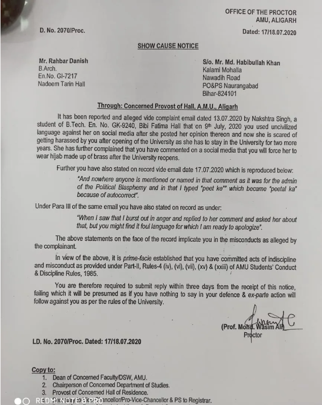 The AMU administration noted that the accused was involved in ‘misconduct’ as stated by the complainant. As such, the administration has directed Danish to submit his reply to the show-cause notice within 3 days, failing which it would be presumed that he has nothing in his defence. Following the expiry of the said three days, disciplinary action will be inititated against him as per the rules of the varsity.