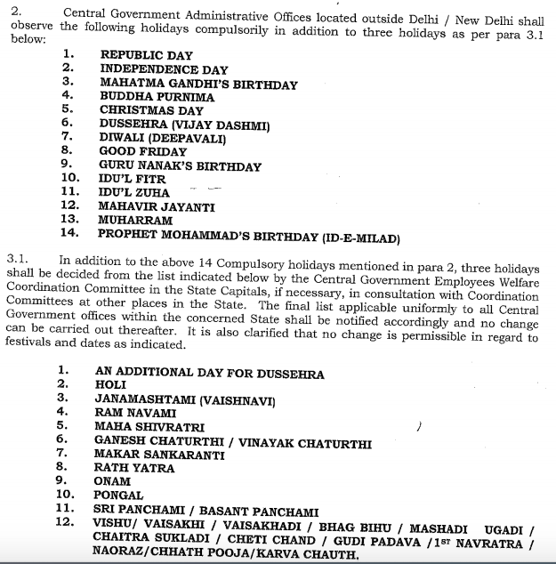 As one can see, out of the 14 compulsory holidays of Central government, 4 are Islamic festivals, 3 Eids and one Muharram. Only Diwali is the major Hindu festival which is a government holiday. Holi and other festivals fall under the ‘3 optional holidays’ one can avail. As one can see, Raksha Bandhan does not even fall in the list of optional holidays one can avail.