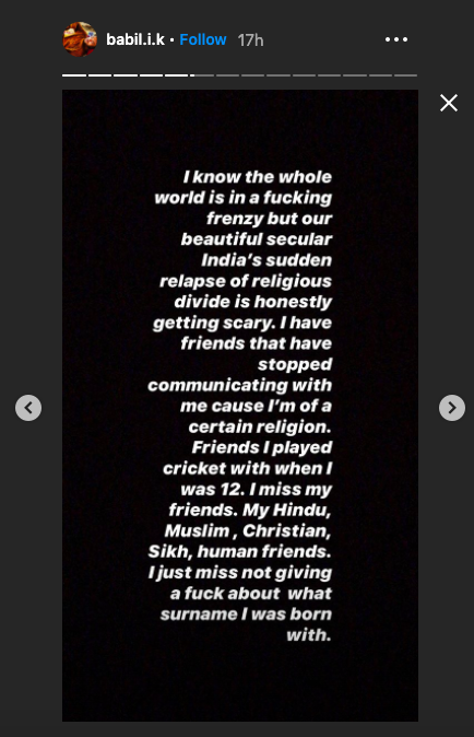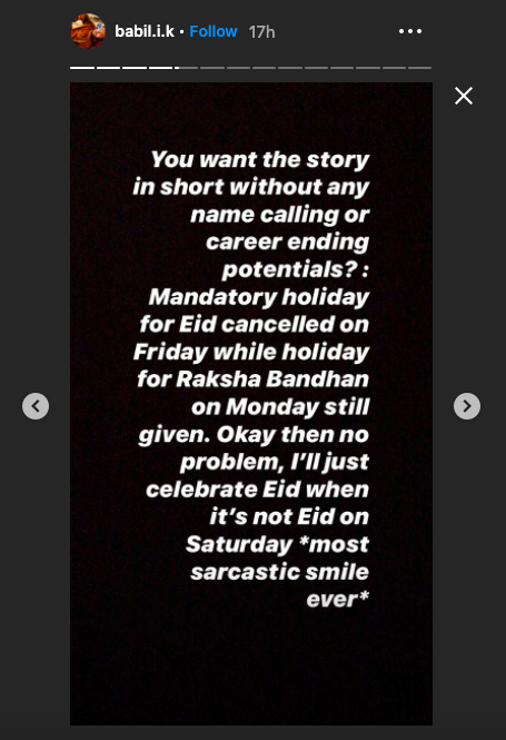 Babil Khan claimed that he does not want to be judged by his religion and he is a human being just like rest of the Indians. Khan was upset that the mandatory holiday for Bakra Eid which falls on Friday is cancelled and Raksha Bandhan, which falls on Monday is a holiday. He claimed that secular India is having a relapse of ‘religious divide’ and is getting scary.