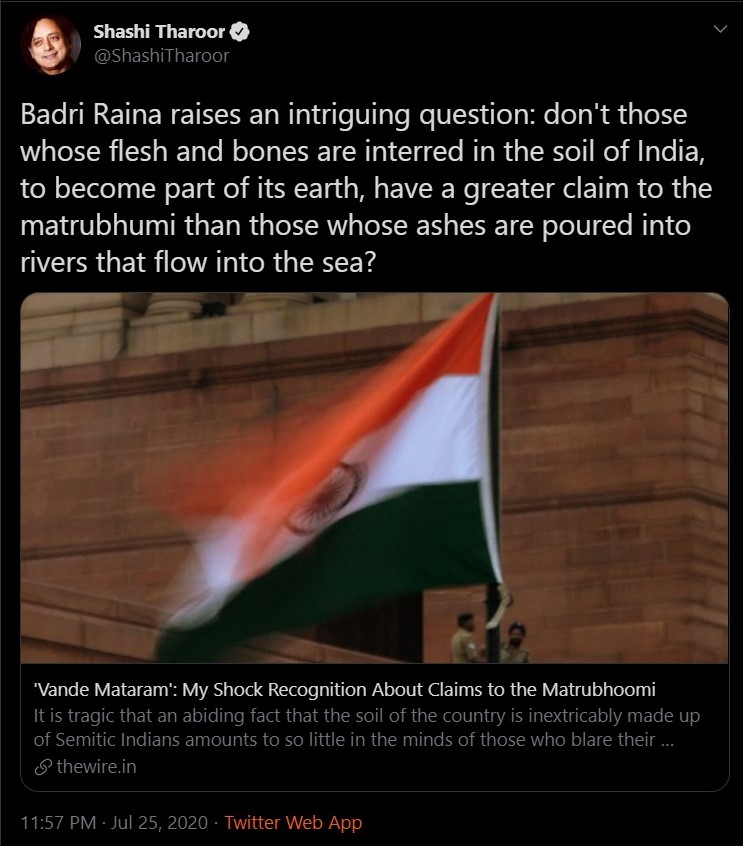 Any person with an iota of a functional brain would dismiss such assertions without so much as a second thought. Therefore, naturally, senior leaders of the Congress party have found great merit in them. Shashi Tharoor said it was an ‘intriguing question’ and said, “Don’t those whose flesh and bones are interred in the soil of India, to become part of its earth, have a greater claim to the matrubhumi than those whose ashes are poured into rivers that flow into the sea?”