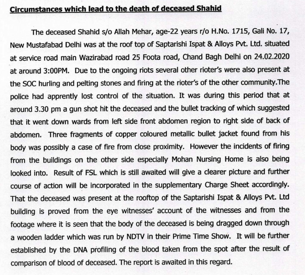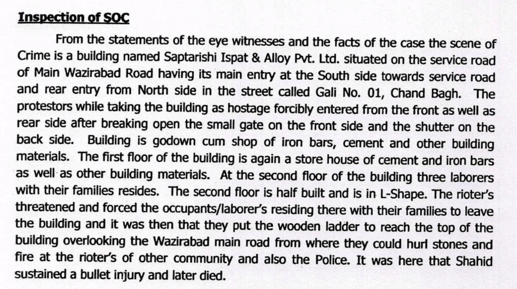 The chargesheet mentions the circumstances that led to the death of Shahid Alam rather clearly. It states that he was at the rooftop of the Saptarishi Ispat & Alloys Pvt Ltd building on the 24th of February at around 3:00 PM. Due to the riots, along with Shahid, several others were present on the rooftop of the building, pelting stones and shooting at the police and the Hindus. The police at this time had lost control of the situation.