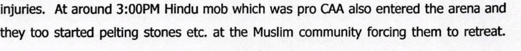On the 23rd of February, Bhim Army had called to march from Chand Bagh to Rajghat. That was an illegal march which was then stopped by the police. The statement by a Muslim witness (name withheld) says that several Muslims, Dalits and students had congregated for the march by Bhim Army which was stopped by the police. Thereafter, the police had sealed the Wazirabad road after stopping the march. A rumour was then spread that violence had erupted on another protest site in Jaffrabad.