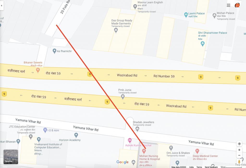 In Google Map, one can see Mohan Nursing Home. Saptarishi Ispat & Alloy Pvt Ltd building doesn’t feature on Google Maps but since we know it is in the service road of 25 foota road, we can estimate the location to the other side of the Wazirabad Road.