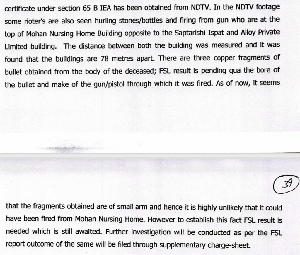 The chargesheet categorically mentions that even the footage of Hindus firing from Mohan Nursing Home was examined. The distance between Mohan Nursing Home and Saptarishi building is about 78 meters. The bullet fragments retrieved from the body of Shahid Alam seems to be of a bullet fired from a small arm and hence, the police thinks that it is “highly unlikely” that it could have been fired from Mohan Nursing Home.