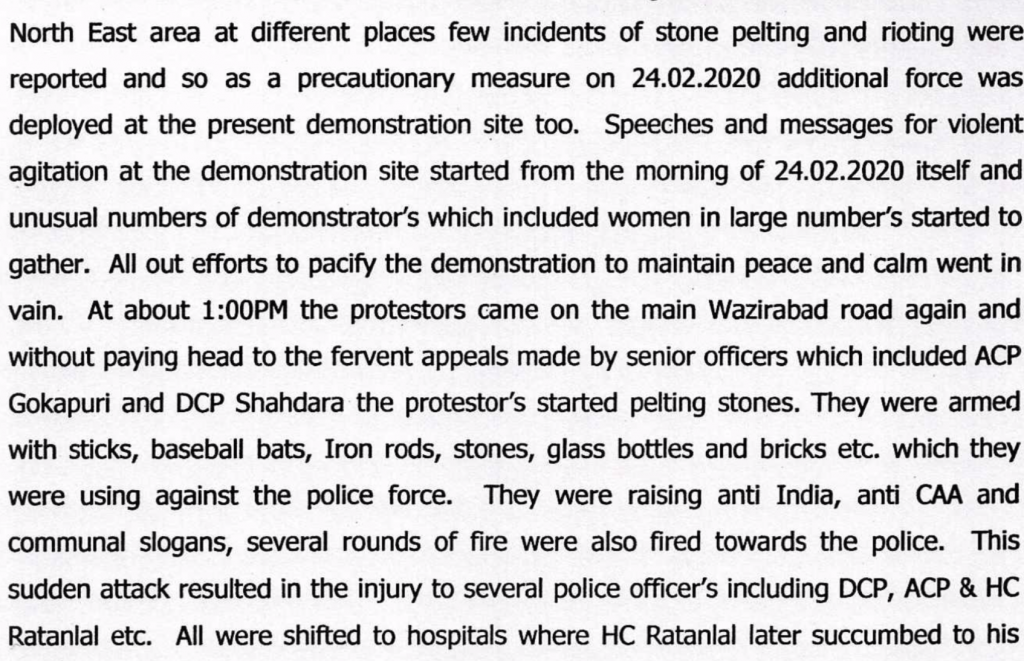 On the 24th, at around 1 PM, an unusually large crowd gathered at Main Wazirabad Road and a riot started. The Islamist mobs started pelting stones and beating up the police with iron rods, acid bottles, sticks, stones, bricks etc. In the process, over 40 police officers were injured and Ratan Lal was killed by the mob.