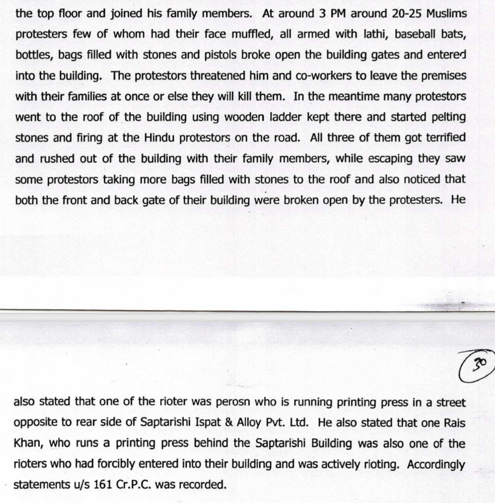 The labourers who were threatened to flee the building with their families had similar stories to tell. At 3 PM, about 30 Muslim rioters forcibly entered the building and threatened the labourers to leave. A wooden ladder was used to reach the rooftop of the building. When the labourers were fleeing, they saw others carrying sacks of stones and bricks to the roof. The rioters were also carrying firearms. This entire sequence was also corroborated by the statements of 5 policemen who were at the scene. They narrated how the Muslim mob was attacking the police and it was only after the Hindus started their retaliation, did the Muslim mobs’ retreat.