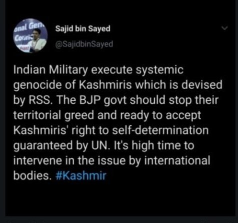 According to the reports, an FIR was registered against Sajid Bin Sayed on 8 July on the basis of this tweet where he had made anti-India propaganda by accusing the Indian Armed Force of executing systemic genocide of Kashmiris, which is devised by RSS.