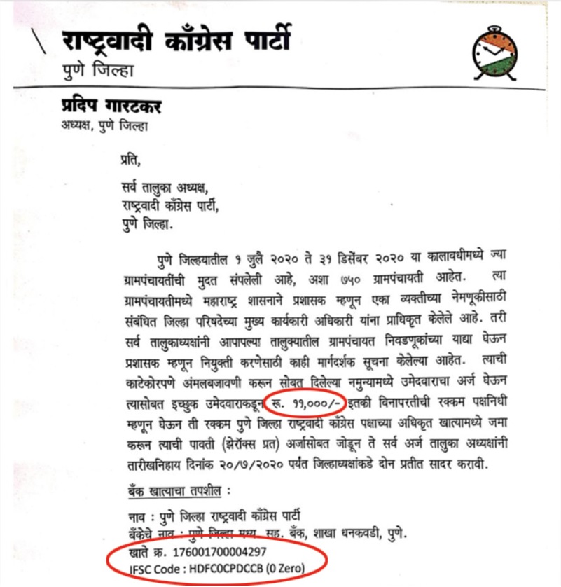 “All taluka presidents (of the party) have been given guidelines regarding appointing administrators based on lists of their gram panchayats that would have gone to polls. Following those guidelines strictly, application forms as attached must be filled out by all applicants and submitted along with a non-returnable party fund donation of Rs 11,000 that must be credited to the official bank account of the NCP Pune district,” the letter read which carried the signature of NCP leader Pradip Garatkar.