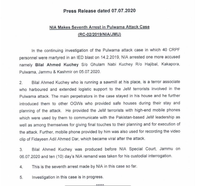 The National Investigation Agency, which has been in a relentless pursuit to nab Pakistan backed Jaish-e-Mohammad (JeM) terrorists behind the Pulwama terror attack, which claimed the lives of 40 CRPF personnel on February 14, last year, has now made the 7th arrest in the case. In a press release dated July 7, 2020, NIA named the 7th accused as Bilal Ahmed Kuchey, a resident of Kakapora, Pulwama who was nabbed by the agency on July 5 (Sunday). Prior to his arrest, the agency has arrested six people associated with the crime.