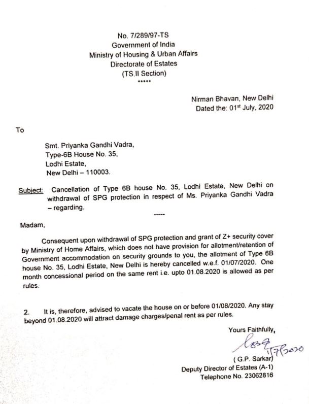 In November last year, Priyanka had lost her SPG cover. Priyanka Gandhi Vadra, a private citizen, was allotted Type IV bungalow in February 1997 on recommendation of the SPG, home ministry and cabinet secretariat. With SPG cover gone, she is yet to vacate her government accommodation, considering she does not hold any public office.