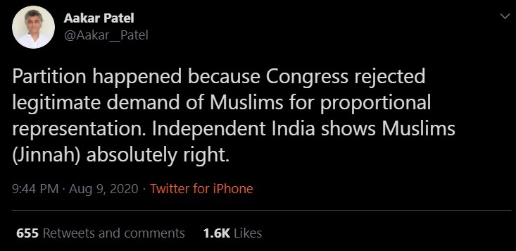 Aakar Patel whitewashed the real reasons behind the creation of Pakistan and claimed that partition occurred because the Congress at the time refused to accede to the ‘legitimate’ Muslims demand for proportional representation. He claimed that Independent India has proved Jinnah correct. Thus, the ‘humanitarian activist’ blames Hindus for the Muslim demand to establish a separate Islamic state.