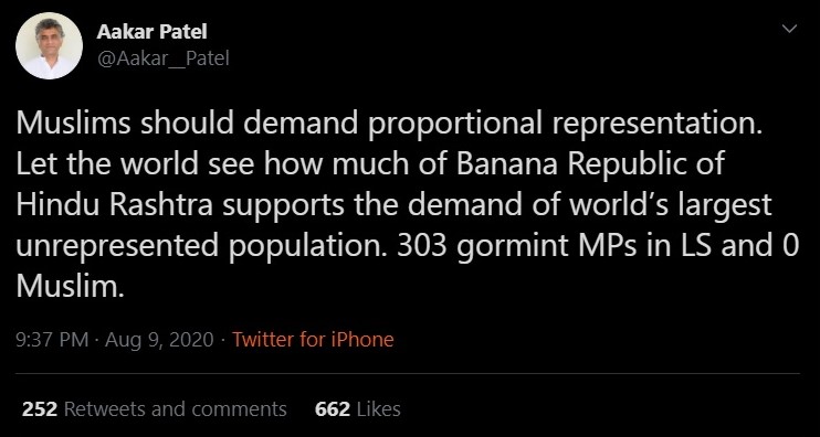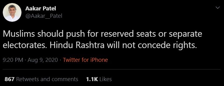 While inciting Indian Muslims to demand reserved seats or separate electorates, Aakar Patel insisted that the “Hindu Rashtra will not concede rights”, implying that it is a legitimate demand.