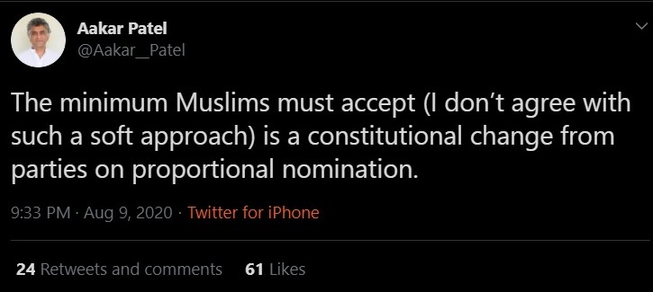 Aakar Patel also said that Indian Muslims should demand proportional representation. A ‘proportional representation’ would mean that a certain number of seats in elected bodies would be reserved for Muslims. Some individuals also take it to mean that a certain number of positions within the bureaucracy and the Army should be reserved for Muslims.