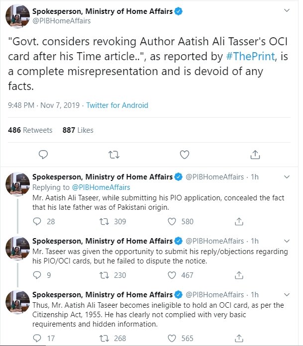 The home ministry had stated that Taseer had hidden the fact in his documents that his father was a Pakistani man. Indian law does not allow OCI status to children of Pakistani and Bangladeshis. Taseer was even given an opportunity to submit his objections but he failed to comply. “Thus, Mr Aatish Ali Taseer becomes ineligible to hold an OCI card, as per the Citizenship Act, 1955. He has clearly not complied with very basic requirements and hidden information,” the MHA said.