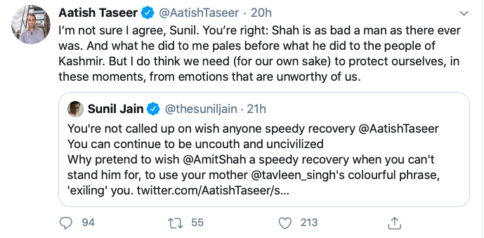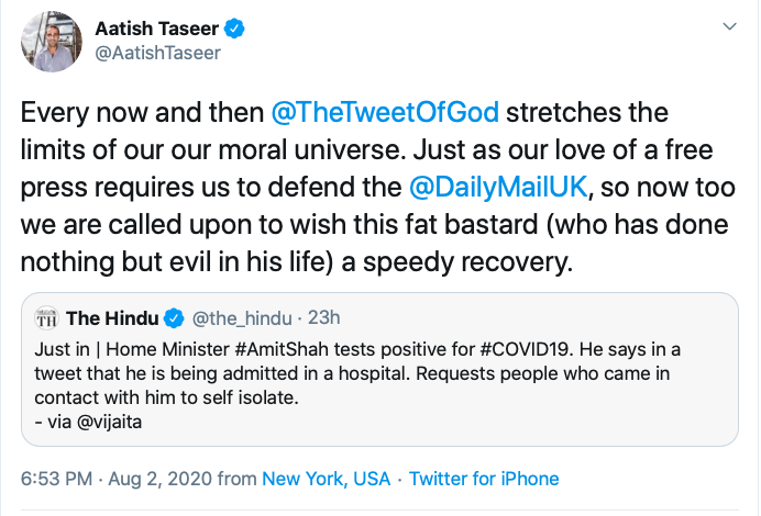 One of them was journalist Tavleen Singh’s son Aatish Taseer. Taseer holds inexplicable anger against the Indian government, especially the home ministry. Showing an unusual amount of rage and hatred, Taseer tweeted in amusive tones, lamenting that he would probably have to show fake concern and wish for the speedy recovery of Amit Shah. He even called Amit Shah a ‘fat bastard’.