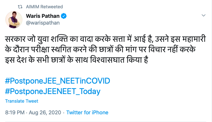 On Wednesday, Waris Pathan, a former AIMIM legislator took to Twitter to claim that the Modi government, which had come to power by promising to empower youths of the country, has now betrayed them by deciding to conduct NEET-JEE exams.