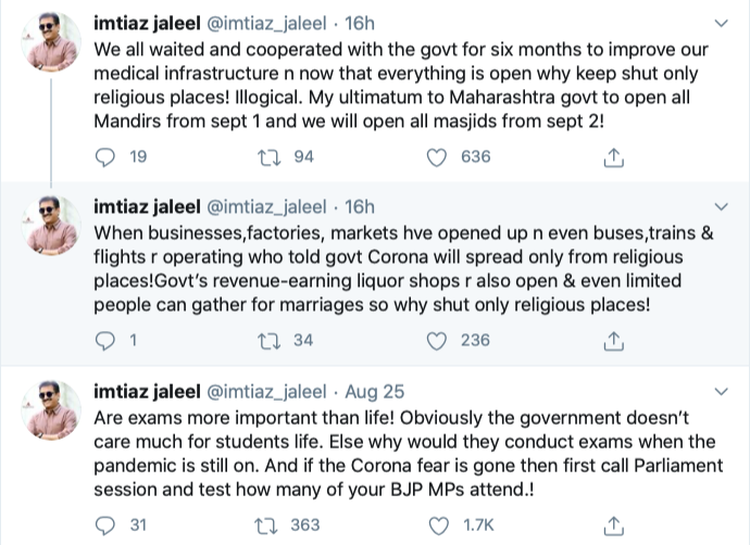 Ironically, Imtiaz Jaleel himself has asked for the postponement of the NEET/JEE exams, a day before going ahead and tweeting that the government should open all mosques.