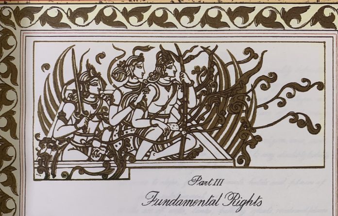 The Constitution of India has a sketch of Lord Ram, Mata Sita and Lakshman returning to Ayodhya after killing Ravan in Lanka. The image appears at the beginning of the chapter related to the Fundamental Rights.