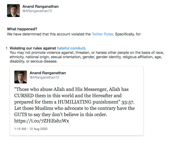 They also appealed to reinstate his account.Is quoting quran verse a blasphemy? @Twitter is this your Islamophobia? @ARanganathan72 #BringBackAnandRanganathan