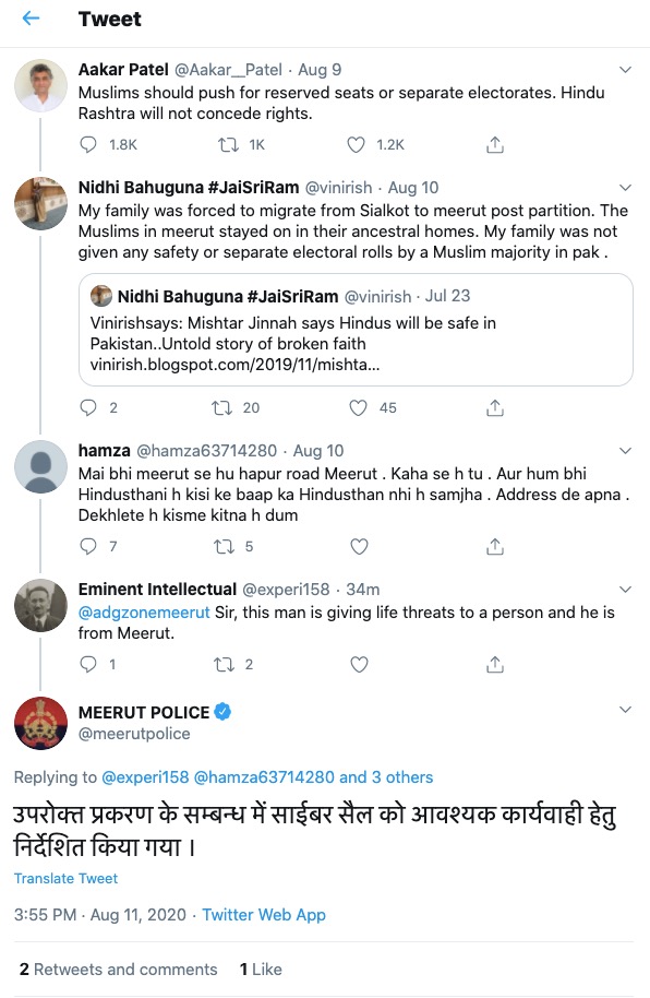 The threat was issued by a user named ‘Hamza’ after Nidhi responded to ‘human rights activist’ Aakar Patel’s highly provocative tweet, urging Muslims to demand for reserved seats or separate electorates. Patel’s incendiary tweet exhorting Muslims in India to demand proportional representation in the Parliament and elected bodies elicited a prompt reply from Nidhi Bahugana, highlighting how her family, who originally hailed from Sialkot before the partition, were not granted any safety or electoral rolls in the Muslim majority Pakistan.