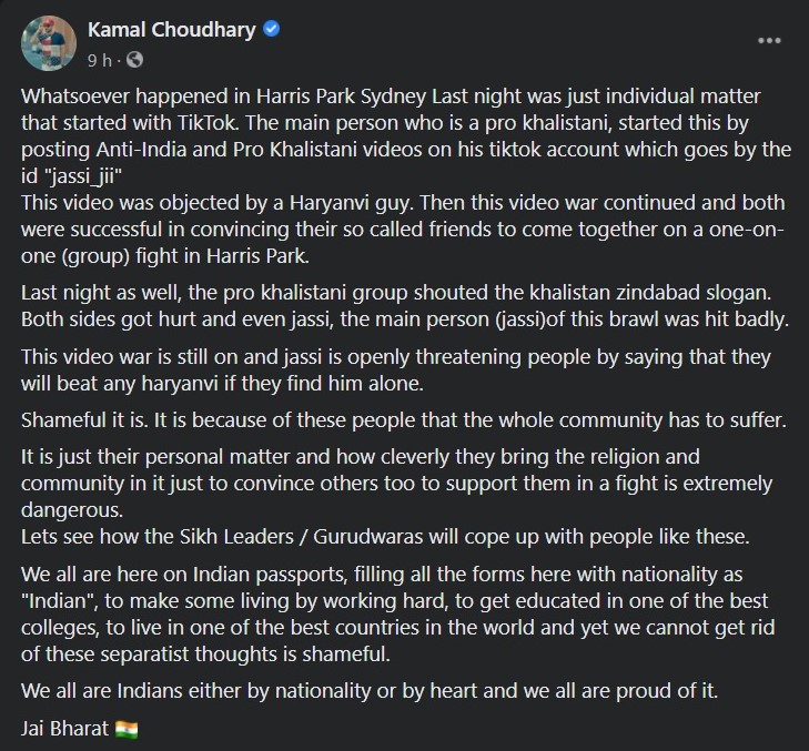 A band of Haryanvis clashed with a group of Khalistanis at Harris park in Sydney, Australia on Friday night in an organised brawl following a quarrel that ensued over an argument on TikTok. It was apparently broadcast through the social media platform. According to Punjabi singer Kamal Choudhary, the fight started after Jassi, a Khalistani, started posting pro-Khalistani and anti-India content on TikTok.