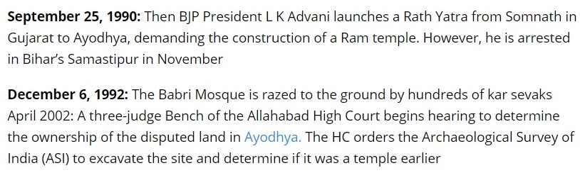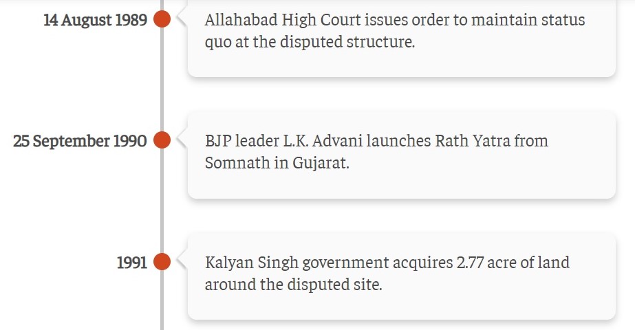When a timeline of any issue of historical importance is prepared, it is expected that the major incidents will make it to the list even if it makes the timeline a little longer than previously planned. A timeline of major events ought to contain in them the major events that occurred related to the matter at hand, in this case, the Ram Janmabhoomi dispute.