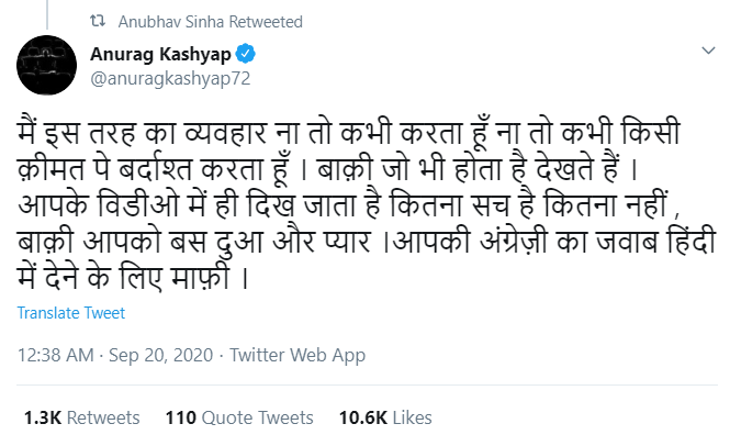 Congress worker Pankhuri Pathak retweeted the ‘victim-blaming’ tweet of Vinod Kapri and weaved a political conspiracy behind the allegations. “It’s a matter of coincidence that Anurag Kashyap shows mirror to BJP-propagandist Kangana Ranaut and in just two days, an unknown actress files charges against him.” Dubbing the victim as an ‘unknown actress’ and the incident a ploy of the BJP, Pankhuri further stated, “Not only this, the actress is a big fan of Narendra Modi and BJP leader Paresh Rawal. One coincidence after another…” This was retweeted by Anurag Kashyap himself.