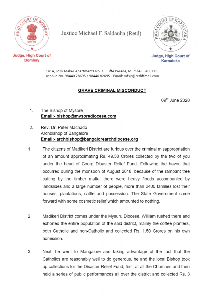 As per a report in Goa Chronicle, former Karnataka High Court Judge Michael F Saldanha had accused Peter Machado and Bishop of Mysuru, K A William, of ‘criminally misappropriating’ ₹49.5 crores collected for Coorg Disaster Relief work in 2018. Accusing William of fraud, he wrote, “Everybody overlooked the fact that this man was virtually cheating and looting because even after four months, not one rupee reached the victims. In the instances of natural calamity the relief has to be immediate and fast. In this case, neither happened.”