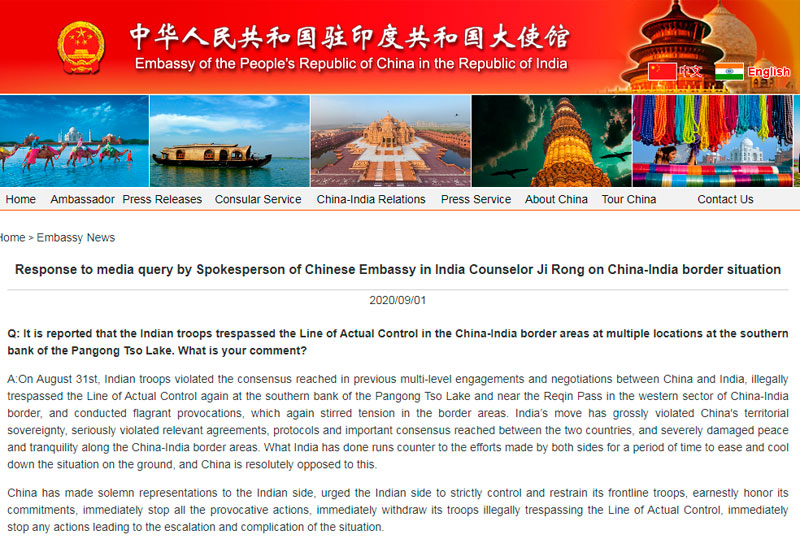 In the statement on the Embassy’s site, they wrote that on 31st August, Indian troops violated the consensus that was reached between the two nations after multi-level engagements and negotiations. China alleged that India had ‘illegally trespassed’ the Line of Actual Control again at the southern bank of the Pangong Tso Lake and near the Reqin Pass in the western sector of the China-India border.