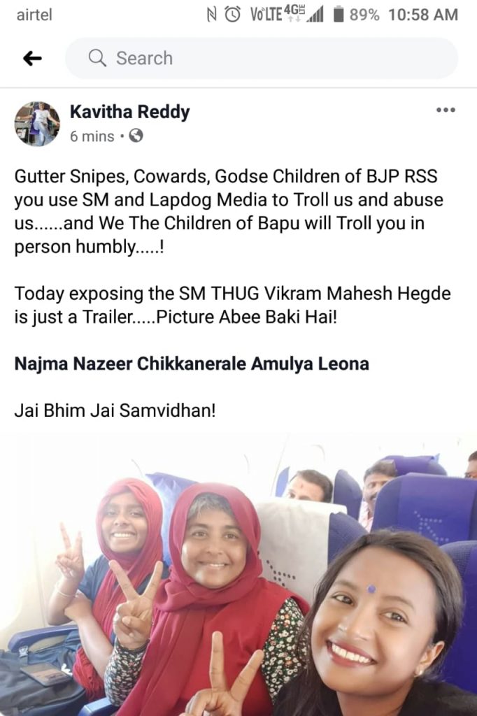 In January this year, Kavitha Reddy had joined hands with far-left activist Amulya Leona to publicly heckle journalist Mahesh Vikram Hegde at Mangaluru airport. Reddy, along with anti-CAA ‘protestors’ Najma Nazeer and Amulya Leona, had confronted Mahesh Hegde and coerced him to sing “Vande Mataram” to prove his patriotism for the country.