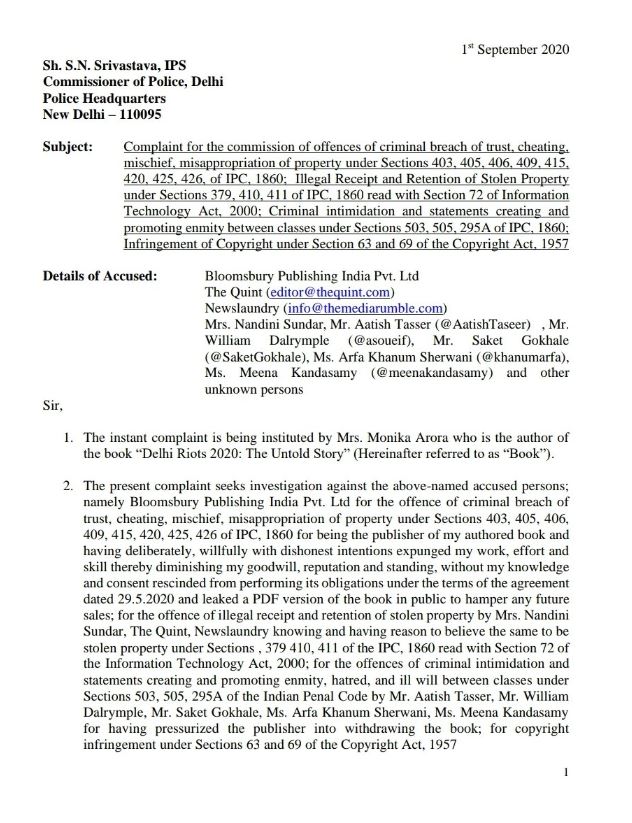 Filed criminal complaint against @BloomsburyIndia @AatishTaseer @DalrympleWill @khanumarfa @nandinisundar@TheQuint@SaketGokhale 4 hatching criminal conspiracy 2 threaten,harm reputation of authors&book, theft of copyright material, hate speech@CPDelhi has assured strict action pic.twitter.com/tiMznKBkS3