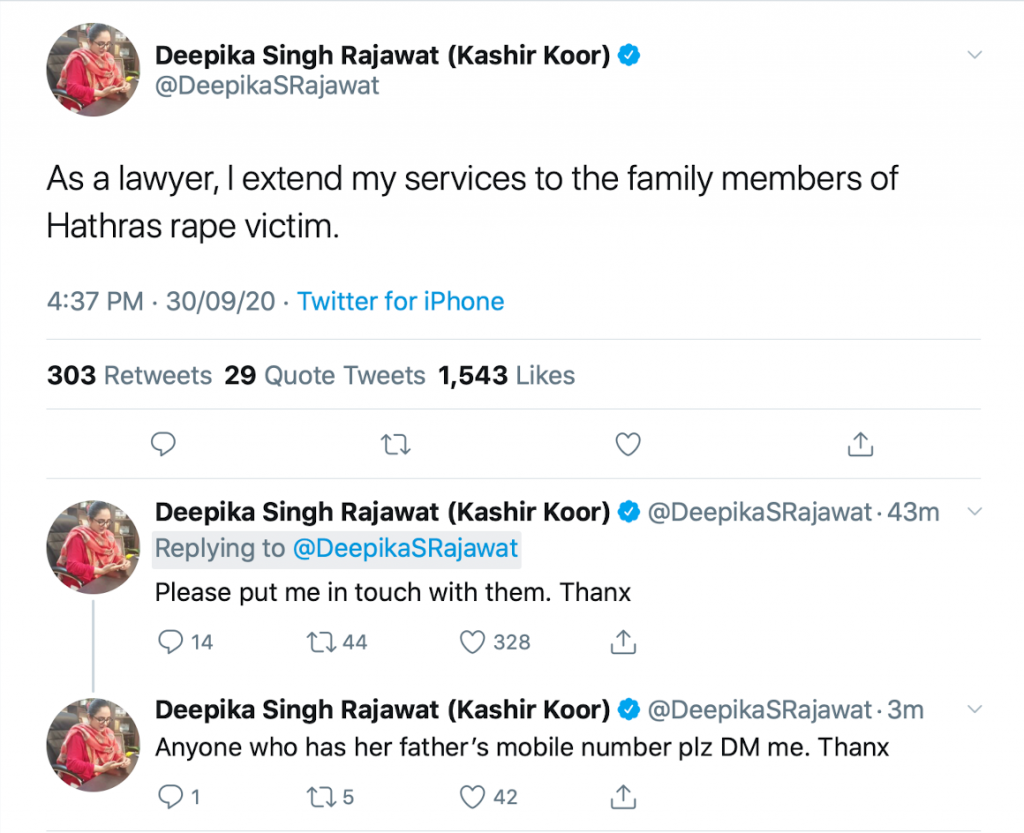 “As a lawyer, I extend my services to the family members of Hathras rape victim,” Deepika Singh Rajawat tweeted.