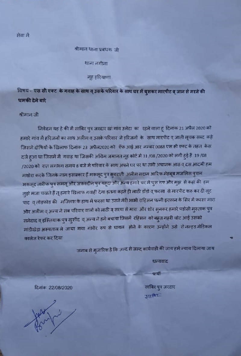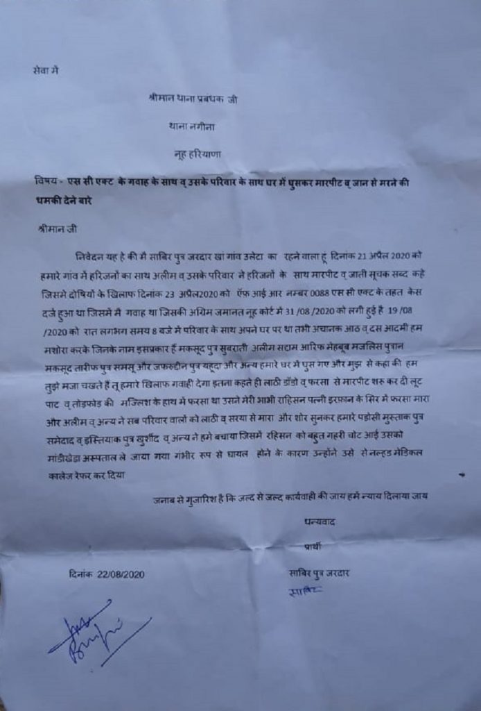 At around 6 pm on June 29, these assailants had allegedly intercepted Hakimuddin’s brother Mohammed Omar and warned him against supporting the Dalit family. “You will have to pay a heavy price if you dare to help or testify for Rahul”, the Muslims assailants threatened Omar who reportedly did not cede to their threats and said intrepidly that Rahul was a poor and innocent member of the village and as his neighbour, he is duty-bound to help him.