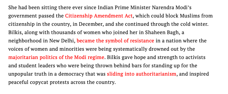 The Islamic troll Rana Ayyub further continues saying that Bilkis, along with thousands of women who joined her in Shaheen Bagh, which according to her became the ‘symbol of resistance in a nation’ where the ‘voices of women and minorities were being systematically drowned’ out by the majoritarian politics of the Modi regime.