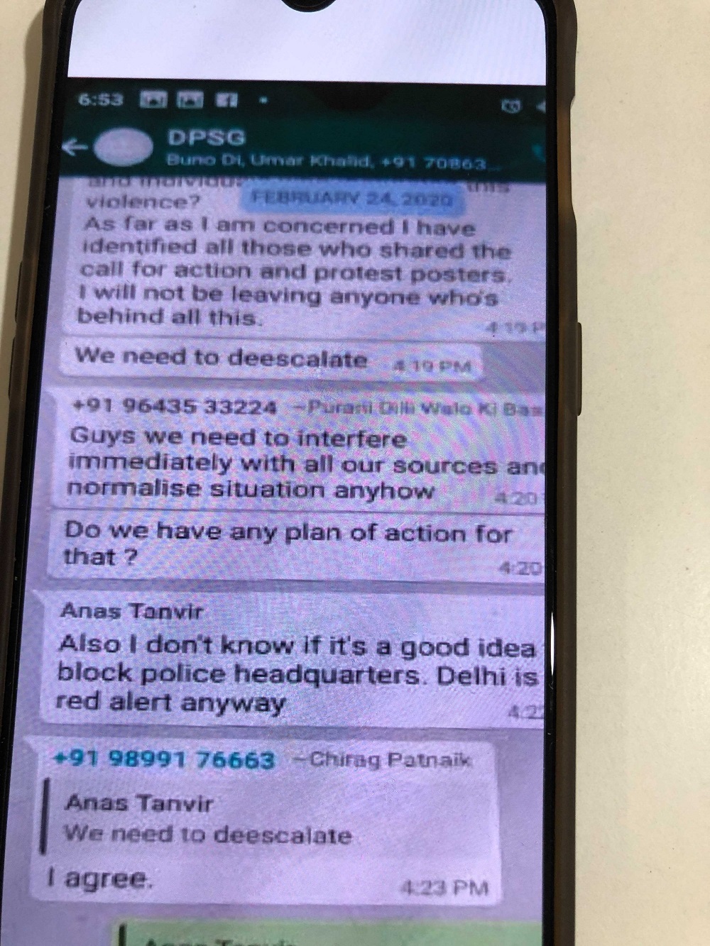 The plan to block Delhi Police headquarters is also being discussed in this group. Anas Tanveer’s texts show that he (and others in the group) are aware which specific people had worked to spread violence and he is urging other group members to be ready to identify them. Why did they want to block police headquarters when riots are spreading in the capital is another question that arises in this conversation.