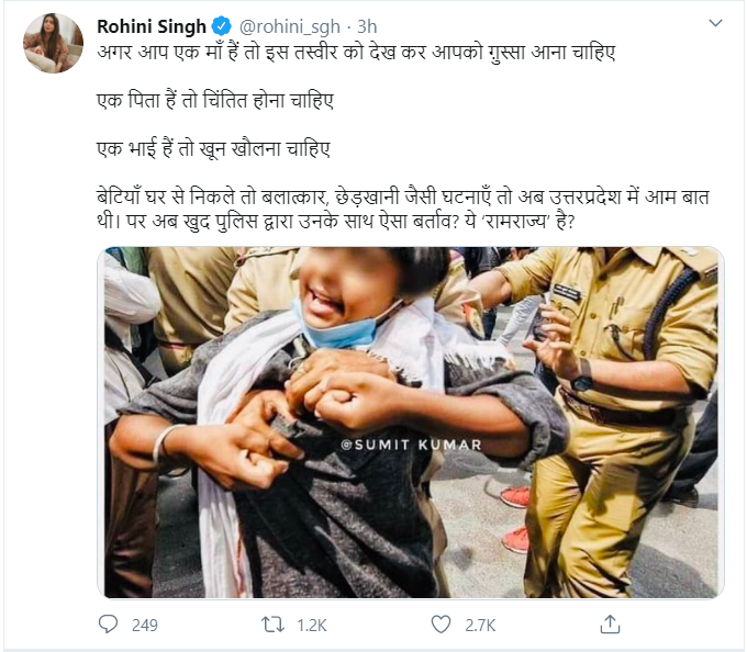 She further continued, “When girls step out of their house in UP, they are faced with eve-teasing and rape. But, they are being subjected to the same treatment by the police.” Invoking political connotations, Rohini Singh asked, “Is this ‘Ram Rajya’?”