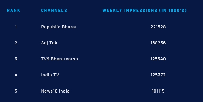 Republic Bharat is also in the top position for the 9 pm slot, although the difference with the competition narrow, unlike the English channels. The channel has 15.8% share for 9 pm, marginally ahead of 14.28% of Zee News, Aaj Tak’s 14.06%, News18 India’s 12.22% and India TV’s 11.58%.