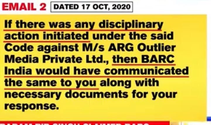 “If there was any disciplinary action initiated under the said code against M/s ARG Outlier Media Private Ltd., then BARC would have communicated the same to you along with necessary documents for your response,” the e-mail written by BARC to Republic TV CEO says rejecting the claims made by Mumbai Police chief Param Bir Singh.
